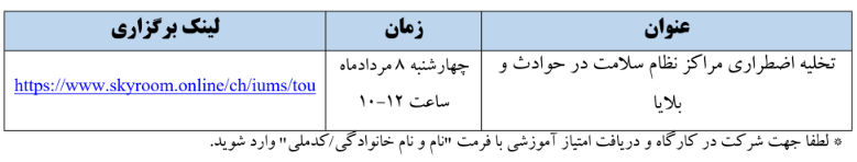 موسسه عالی تربیت و توسعه مدیران نظام سلامت وزارت بهداشت در نظر دارد با همکاری ستاد هماهنگی بهداشت و درمان استان تهران، پیرو سلسله کارگاه های غیرحضوری مدیریت بحران و بلایا، کارگاه غیر حضوری با محوریت "تخلیه اضطراری مراکز نظام سلامت در حوادث و بلایا" را به شرح ذیل برگزار نماید.