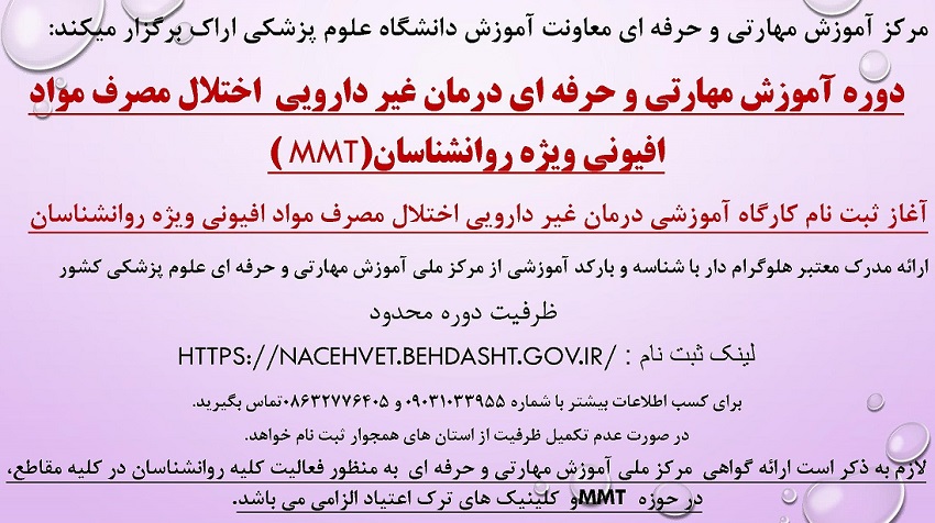 به اطلاع می رساند مرکز آموزش مهارتی و حرفه ای دانشگاه علوم پزشکی اراک در نظر دارد، دوره آموزشی و مهارتی اختلال مصرف مواد افیونی را ویژه روانشناسان برگزار نماید .
